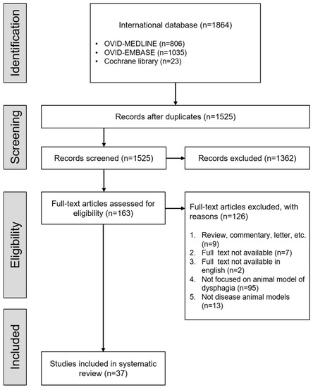 Title and abstract were screened by J-Y Kim to select the articles for this systematic review. The following inclusion criteria were established: disease animal models inducing oropharyngeal dysphagia and articles that evaluated induced oropharyngeal dysphagia in disease animal models. Aging-related dysphagia were excluded because the purpose was to introduce oropharyngeal dysphagia in disease animal models. Articles using an animal model of dysphagia were excluded unless an evaluation for dysphagia was provided. Only peer-reviewed research articles were included. All other types of articles were excluded.