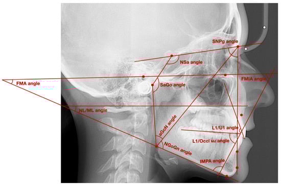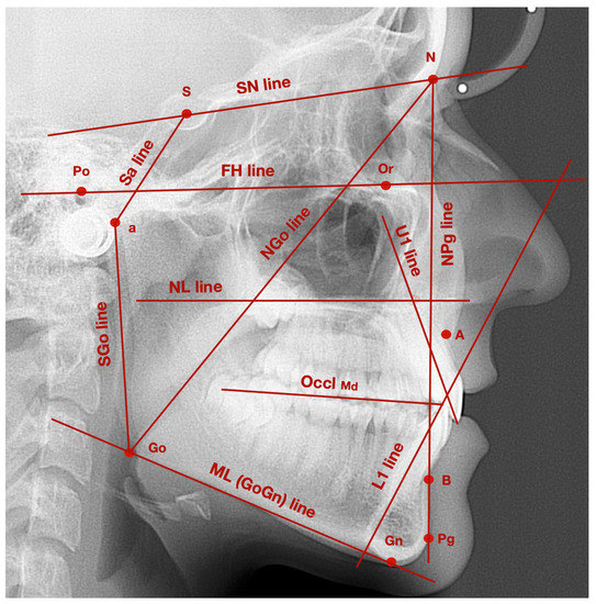 Analysis of lateral cephalograms included different measurements originating from various cephalometric analyses, including Steiner, Jacobson, Tweed, Jarabak and Arnett [21,22,23,24,25,26]. Cephalometric analyses were performed with the software Ortodoncja 9.0 (Ortobajt, Wroclaw, Poland).