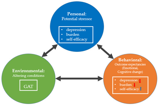 In this study, Personal contains potential stressors such as depression, burden, and self-efficacy. Environmental means the aspect of the setting that influences an individual’s ability to complete a behavior successfully, and it may improve emotional, cognitive, or motivational processes. We tried to alter the conditions of the caregiver with GAT. Behavioral refers to the response an individual exhibits after performing a behavioral, emotional, cognitive, or motivational process. We hypothesized that if the caregiver experiences a positive outcome with successful learning as a result of performing GAT behavior, their depression and burden would be lessened, and self-efficacy will increase.