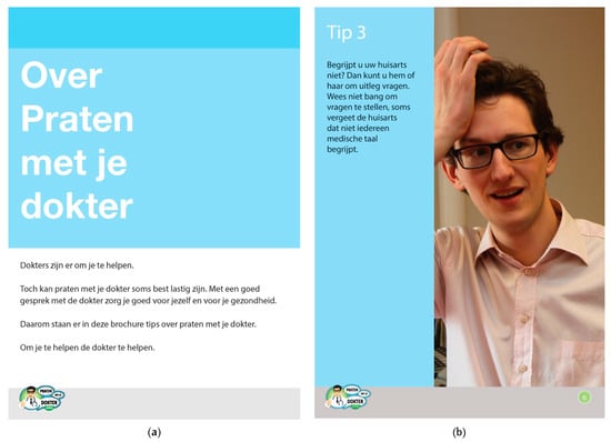 - van’t Jagt, R.K.; De Winter, A.F.; Reijneveld, S.A.; Hoeks, J.C.J.; Jansen, C.J.M. Development of a communication intervention for older adults with limited health literacy: Photo stories to support doctor-patient communication. J. Health Commun. 2016, 21 (Suppl. 2), 69–82. [Google Scholar] [CrossRef] [PubMed]