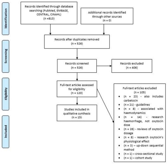 The research yielded 813 results, extracted from one database. All duplicates were removed, 526 articles were checked manually for relevance by screening their titles and abstracts. A total 120 results met the inclusion criteria, but only 15 were included after a full-text review. Only full-text articles were selected because the information given in the abstract was not sufficient for the thorough analysis. The randomized trials, conducted in 2008–2020, which compared different doses of oxytocin or oxytocin and placebo given for patients during CD, in order to investigate the effect of the drug on PPH and uterine contraction, were analyzed. A total of 105 publications were excluded for reasons explained in Picture 1.