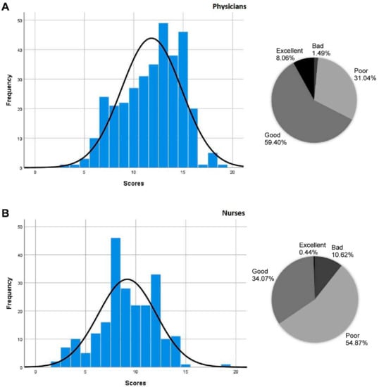 Figure 1 depicts the participants’ global knowledge in palliative care. Seventy-eight nurses (34.51%) showed excellent or good knowledge, and 148 (65.52%) poor or bad knowledge. The mode score was 8/20 (n = 46). Two hundred and twenty-six physicians (67.40%) showed excellent or good knowledge, with a response mode of 13/20 (n = 49), followed by 15/20 (n = 46). One hundred and nine physicians (32.53%) showed poor or bad knowledge.