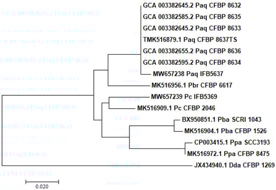 - Portier, P.; Pédron, J.; Taghouti, G.; Fischer-Le Saux, M.; Caullireau, E.; Bertrand, C.; Laurent, A.; Chawki, K.; Oulgazi, S.; Moumni, M.; et al. Elevation of Pectobacterium carotovorum subsp. odoriferum to species level as Pectobacterium odoriferum sp. nov., proposal of Pectobacterium brasiliense sp. nov. and Pectobacterium actinidiae sp. nov., emended description of Pectobacterium carotovorum and description of Pectobacterium versatile sp. nov., isolated from streams and symptoms on diverse plants. Int. J. Syst. Evol. Microbiol. 2019, 69, 3207–3216. [Google Scholar] [CrossRef] [PubMed]