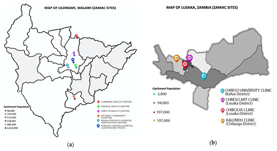 - Shiroya, V. Project ZaMaC Health Facility Map of Lilongwe District and Lusaka Province; Project Zambia-Malawi Collaboration (ZAMAC): Heidelberg, Germany, 2019. [Google Scholar]