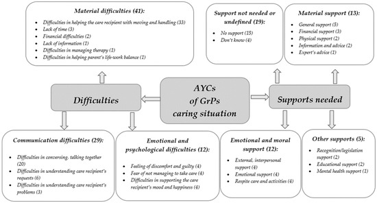 Considering the difficulties encountered by AYCs of GrPs, a qualitative analysis allowed the project researchers to elucidate three core themes, i.e., “material”, “communication”, and “emotional and psychological difficulties” (Figure 1).