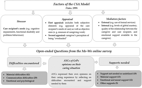 In order to provide insights for a theoretical understanding of AYCs of GrPs, the discussion will now focus on the delineation of a proposed conceptual framework building on the qualitative findings from the Me–We online survey study. The themes and subthemes identified through the thematic analysis were framed in the CSA model dimensions [27]. As shown in Figure 2, a. the difficulties encountered in caregiving were read as stressors, b. and answering the open-ended questions was considered as a form of appraisal, since this action entailed self-reflection; c. the support needs helped to identify measures (mediators in the CSA model) that are able to mitigate the negative caregiving outcomes and hopefully improve AYCs’ well-being.
