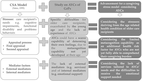 The second objective is to create a more in-depth understanding of the phenomenon by making use of the main empirical findings to put forward the essence of an evidence-based conceptual framework on AYCs of GrPs. To this purpose, the findings were framed within the caregiving stress appraisal model (renamed CSA model) proposed by Yates et al. [27].