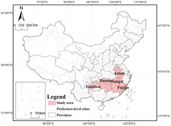 Jiangxi, Fujian, and Guizhou comprise the first batch of National Pilot Zones for Ecological Conservation in China, with an excellent ecological environment, but the ecological advantage does not directly match the economic advantage. The economic development process of areas with a certain ecological advantage has occurred at a disadvantage for a long time [40], which is quite evident in the agricultural economy. Moreover, with increasing agricultural mechanization levels in China, regional carbon emissions have continuously risen. In addition, farmers use land intensively, but cultivated land is lightly maintained in the process of cultivated land utilization, while large amounts of chemical fertilizers and pesticides are applied, resulting in increasing pressure on regional resources and the environment and worsening environmental problems. In addition, ecological civilization construction is facing challenges. Therefore, in response to the call to reduce the application of chemical fertilizers and pesticides, decrease the discharge of harmless agricultural solid waste and improve green ecological agriculture, as proposed by the state in the Implementation Plan for National Ecological Civilization Pilot Zones, we must correctly understand the coupling and coordination of economic development and ecological protection in cultivated land utilization and strive to realize the unification and optimization of ecological, economic and social benefits, thereby promoting the construction of National Pilot Zones for Ecological Conservation in China. Based on these considerations, this paper selects 57 prefecture-level cities in the first batch of National Pilot Zones for Ecological Conservation in China (Jiangxi, Fujian, and Guizhou), in addition to Anhui and Hunan provinces (Figure 1), as the research object, studies the temporal and spatial patterns and evolution trend of the CLUE from the perspective of comparative analysis and provides theoretical support to improve the construction and leading role of National Pilot Zones for Ecological Conservation in China.