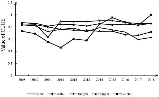 Change trend of the CLUE in the study region from 2008 to 2018.