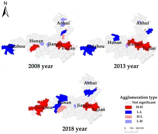 In 2013, the H-H and L-L agglomeration areas of the CLUE revealed an increased scale of single-core agglomeration. An H-H single-core agglomeration area was still located at the junction of Jiangxi and Fujian provinces, comprising Yingtan, Yichun, Fuzhou, and Nanping. An L-L single-core agglomeration area was located in the west of Guizhou Province and comprised Guiyang, Bijie, Liupanshui, and Anshun. Compared to 2008, the geographical location of the H-H and L-L single-core agglomeration areas did not shift. According to the number of cities, the agglomeration scale expanded by 100% and 33.3%, respectively, and the positive spatial spillover effect was notable.