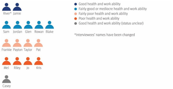 Those categorised as reporting mediocre or fairly good health and work ability are depicted in light blue in Figure 1, comprising Sam, Jordan, Glen, Rowan and Blake—also pseudonyms. Those reporting fairly poor health and work ability are depicted in light pink and include Frankie, Payton, Taylor and Pat.