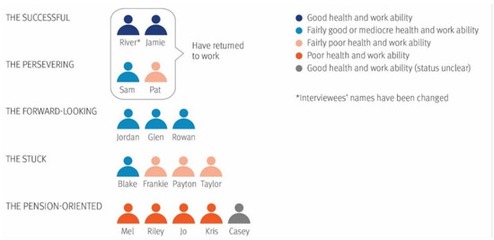 Previous research has found that individuals with decreased work ability are a heterogenous group, but this qualitative study’s main finding was that five distinctive groups could be identified among those with decreased work ability based on their orientations towards work or pension, their self-assessed health and work ability and their perceptions concerning the future: Those in the Successful group had managed to recover well and were motivated to return to their old jobs. Those in the Persevering group returned to work despite enduring pain and persistent work ability concerns. Those in the Forward-looking group had not recovered, nor returned to work, but were optimistically searching for new vocations in which they could flourish despite their health limitations. Those in the Stuck group had not recovered, nor returned to work, but unlike the previous group, they were passive and hesitant about returning to work. Those in the Pension-oriented group had complex problems, and they had given up hope of ever returning to work and instead clearly were inclined towards retirement.
