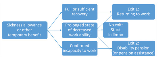 The theoretical contribution of this thesis is the exit path model based on previous literature [12] and this study’s empirical results. The exit path model simplifies the alternative working-life prospects of individuals with decreased work ability into two clear exits—(1) returning to work or (2) retiring with a disability pension—and an additional unclear option of remaining in limbo between resolutions and having (3) no exit. Additionally, other studies [17,25,37] identified this kind of stalemate situations among the participants in their studies. The primary exit from temporary benefits is returning to work, as working supports health and well-being. The secondary exit is retiring with a disability pension, which ends uncertainty and eases the person’s stress caused by feelings of enduring a temporary status and related social benefits. However, if a clear exit is not available, the individual may be locked into remaining in limbo, shifting to and from various temporary benefits [12,14,37].