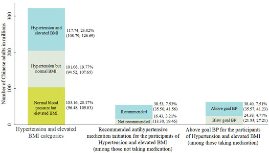 Among the participants who were not taking antihypertensive medication in the hypertensive patients with elevated BMI, about 38.53 (95% CI: 35.50, 41.56) million were recommended antihypertensive medication initiation, and 16.43 (95% CI: 13.30, 19.46) million were not recommended. By contrast, 38.40 (95% CI: 35.57, 41.23) million were above the goal blood pressure and 24.38 (95% CI: 21.55, 27.21) million blow the goal blood pressure among those taking antihypertensive medication in the hypertensive population with elevated BMI (Figure 1).