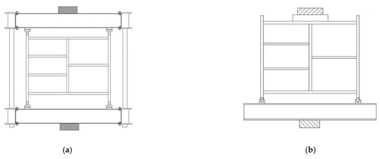 In the vertical load loading test of a scaffold, a strength test is performed by applying a load to four vertical members [15]. Test A presents a test method for a single-bay scaffold consisting of three stories, and Test B presents a test method performed in a multi-bay, that is, two or more scaffolds connected in the horizontal direction.