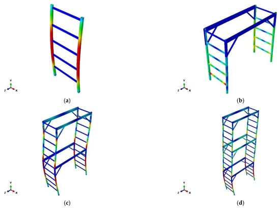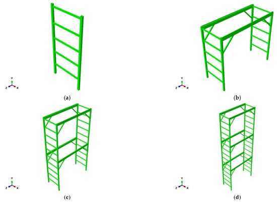 Structural analysis models of fabricated mobile scaffolds and mainframe. (a) Mainframe. (b) Single-story. (c) Two-story. (d) Three-story.