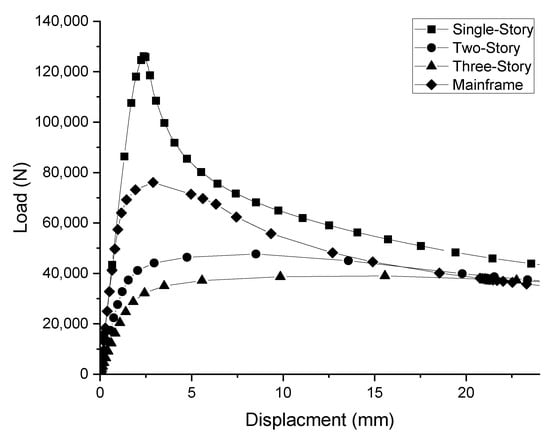 Therefore, in this study, a structural analysis was conducted to understand the ultimate behavior characteristics of the mainframe and finished product, where the vertical load acting on the mobile scaffold was considered as the largest. Through structural analysis, the ultimate loads of the fabricated mobile scaffold mainframe and those for the single-, two-, and three-story versions of the finished product were compared. This was to analyze the rationality of the existing safety certification standards for limiting the ultimate load and vertical displacement of a mainframe. In addition, when a vertical load was applied to an actual finished product, it was intended to determine whether the performance standard of the mainframe presented in the safety certification standard was satisfied.