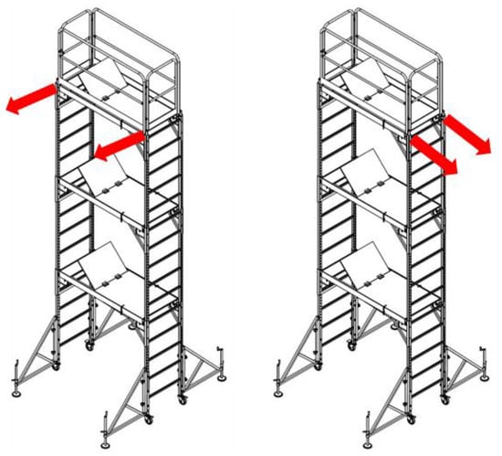 In the standard for mobile access and working towers made of prefabricated elements (EN 1004-1) [16], the materials, dimensions, design loads, safety, and performance requirements of the fabricated mobile scaffolds are presented. The European safety certification standards and performance evaluation methods for fabricated mobile scaffolds can be seen as the only standards presented for finished products (i.e., including caster wheels).