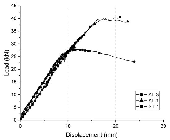 Based on the safety certification standards for strength safety presented in this study, the work classes were classified for the three products for which the vertical load tests were performed. As shown in Table 17, two 1-story and one 3-story fabricated mobile scaffolds were examined. Also, one of the 1-story specimens was fabricated with aluminum and the other was fabricated with steel. Details of the experiments were presented in a previous study (Kim et al., 2021) [7]. Figure 9 shows the load–displacement curves for the vertical load applied to the three specimens. As can be seen from the experimental results, the experimental results for the single-story specimens show results similar to those of the steel and aluminum specimens. However, the loading capacity sharply decreases in the experimental results of the three-story specimen with a high height. According to the research, the governing factor on the ultimate behavior of the 3-story specimen was buckling of the vertical members rather than a failure of the caster wheel. Additionally, in the case of the single-story specimens, the destruction of the caster wheel occurs before the buckling of the vertical member. The experimental study clearly shows that the load-carrying capacity of the fabricated mobile scaffolds cannot be easily estimated by the member strength because the ultimate modes and the governing factor on the global strength are determined by the details of the combination of the main components as well as the material strength. Therefore, it is reasonable to judge a fabricated mobile scaffolding based on safety certification criteria for the overall shape of the structure, rather than using individual member performance-based safety certification criteria.