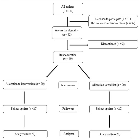 To recruit possible participants, six teams were selected randomly (n = 110 athletes; see Figure 1), and 42 female athletes were again randomly selected. Before randomization, two participants withdrew from the study for personal reasons, and thus 40 athletes were randomly assigned either to the MAC training condition or the active control condition (each group, n = 20) using a random number generator. There was no attrition in either the intervention or active control group after randomization (see Figure 1). Athletes were involved in various types of sport at the time of the study.