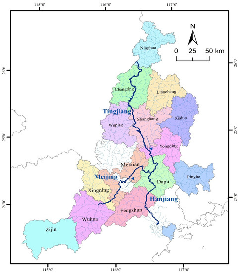 Figure 1 shows the main drainage system of the Tingjiang River. The Tingjiang River is the largest in western Fujian and contributes the most to the water flow from Fujian Province to Guangdong Province, with a total length of more than 300 km [28,29]. The Tingjiang River is one of the four areas with frequent rainfall in Fujian Province and Guangdong Province, and the average annual rainfall is as high as [1500, 2000] mm, which is unevenly distributed in space and time. Further, it gradually decreases from north to south and is mostly concentrated in May to July (accounting for 60% of the annual precipitation) [30]. At present, there are 32 water diversion projects of more than 66.7 ha in the Tingjiang River, and 19 small (primary) reservoirs, among which the total storage capacity of the Cotton Tan Reservoir is the largest. In the Water Resources Bulletin of Guangdong Province in 2018 (http://slt.gd.gov.cn/szygb2018/ accessed on 6 June 2002), its average comprehensive water consumption per capita was 374 m3, where the average water consumption per capita of urban residents was 69 m3, and that of rural residents was 47 m3.