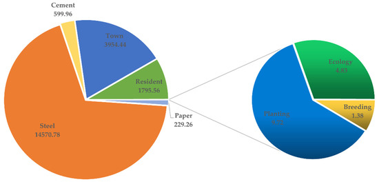 Optimal allocation of water resources is an effective means for solving the uneven distribution of water resources in China, which is conducive to improving the utilization efficiency of the water resources [34,35]. Based on the ITS model data [27], the interval-fuzzy two-stage optimization method was used in this study to solve the optimization model of water resource allocation and eco-compensation mechanism for the Tingjiang River, and the value of the membership degree, , was obtained as [0.08, 0.40]. The optimal water consumption of the water resources allocated to different departments of each administrative unit in the first stage was obtained based on the IFTS optimization method, as shown in Table 1. Taking Shanghang County of Fujian Province along the Tingjiang River as an example, the optimal allocation of water for consumption by different administrative units and different water consumption departments was analyzed based on the simulation results of the IFTS optimization model. Figure 2 shows the adjusted value of the utilization of water resources by different water-consuming departments in Shanghang County in the first stage. The industrial sector of Shanghang County is mainly composed of the papermaking industry, steel industry, and cement industry. To meet the industrial development planning of Shanghang County and the overall sustainable development requirements of the Tingjiang River, the optimization results from the IFTS optimization model predicted that Shanghang County in Fujian Province should allocate 229.26 × 104 t of water resources to the paper industry, 14,570.78 × 104 t to the steel industry, and 599.96 × 104 t to the cement industry. In addition, 3954.44 × 104 t of urban water resources in Shanghang County were allocated, and 1795.56 × 104 t of water resources were allocated to residents in Shanghang County. The agricultural sector is mainly involved in two different industries, and 2.13 × 104 t and 9.58 × 104 t should be allocated for farming and planting, respectively. In order to ensure that the ecological environment of Shanghang County meets the relevant requirements, 3.22 × 104 t of water resources were allocated to the ecological department of Shanghang County. Some of the parameters in Table 1 have a value of 0.00, indicating that the district or county did not consider that particular industry as the main industry or did not have the industry, and thus it had little influence on the water resources allocation. Therefore, the optimal allocation of water resources would not be carried out for this industry.