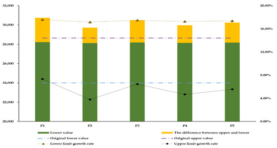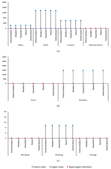 Figure 3 shows the increase in water usage by different departments in the second stage under different hydrological scenarios in Shanghang County. Industry in Shanghang County is mainly composed of papermaking, cement, and iron, and steel. Under different hydrological scenarios, different industries have different water increments in the second stage. Industry is an important driving force for economic development, and water affects industrial development [36]. To ensure regional economic benefits, it is necessary to ensure a basic industrial water supply. The paper industry requires an increased water supply of [0.00, 229.26] × 104 t under the five hydrological scenarios of extreme dryness, dryness, normal flow, abundance, and extreme abundance. For the iron and steel industry, under five hydrological scenarios, Shanghang County should increase the water supply by [0.00, 1370.74] × 104 t. Similarly, for the cement industry, the water supply needs to be increased to [0.00, 599.96] × 104 t. In Shanghang County, the thermal power industry accounts for a relatively small proportion of the industry. Thus, it was considered to cause an increase in the water allocation requirement under the five hydrological scenarios.