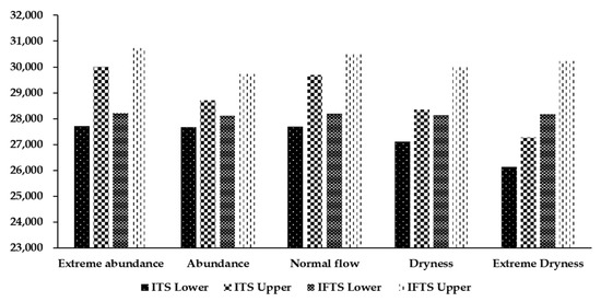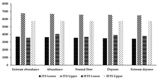 Figure 5 shows a comparison of the economic benefit optimization results obtained from the IFTS and the ITS models. After introducing the fuzzy optimization method, the economic benefit interval of the IFTS model increased by −28.54%, −44.09%, −31.49%, −40.37%, and −36.43%, respectively, under the five hydrological scenarios. The range of the interval values was reduced, the lower limit value of the ITS model was improved, and its upper limit value was reduced. Considering the uncertainty in the upper limit of water resources utilization by each department and the total basin under different hydrological scenarios, the stability and scientific nature of the decision-making system was enhanced, and a reasonable decision-making space was provided for the decision-makers. Figure 6 provides a comparison of the results obtained from the IFTS and the ITS optimization models for river basin eco-compensation. After introducing the fuzzy optimization method, the IFTS model was observed to increase the eco-compensation interval by 9.94%, 54.81%, 15.85%, 50.31%, and 82.90%, respectively, under the five hydrological scenarios, respectively. Basin eco-compensation has a wider range of choices, which provides more possibilities for coordinating economic interests and eco-compensation distribution in the upper and lower reaches of the basin, and the eco-compensation distribution is more scientific and reasonable.
