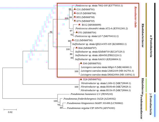 Phylogenetic tree of the QS bacteria isolated from marine HAB species. The black line represents the α-Proteobacteria; the blue line represents the γ-Proteobacteria; the brown line represents Rhodobacteriaceae; the green line represents Rhizobiaceae; the orange line represents Pseudomonadaceae; the red box represents the QS bacteria belonging to the Roseobacter clade; the 10 QS strains are indicated by red triangles.