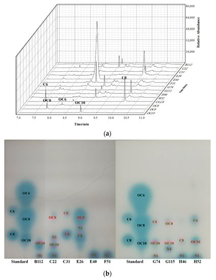 AHLs produced by microalgae-associated QS bacteria via GC-MS (a) and TLC (b) analysis. (a) Ethyl-acetate extracted 10 QS bacteria’ supernatant analysed by GC-MS. The standards included five AHLs: C6 (retention time: 7.54 min), C8 (retention time: 10.17 min), OC6 (retention time: 8.21 min), OC8 (retention time: 7.83 min), OC10 (retention time: 8.96 min). (b) Detection of AHLs signalling molecules using KYC55 as the biosensor strain. The presence of AHLs substance was visualized by TLC. The standards (C6, C8, OC6, OC8, OC10) were marked in black. The AHLs produced by 10 QS bacteria were marked in red.