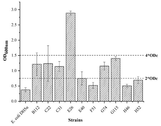 The results of the 10 QS bacterial biofilm formation abilities showed that strains E40, F51, H46, and H52 had weak biofilm formation capabilities with OD values of 0.751, 0.520, 0.507 and 0.694, respectively (Figure 3). Strains B112, C22, C31, G74 and G115 had medium biofilm formation ability with OD values of 1.214, 1.234, 1.139, 1.152 and 1.403, respectively. Strain E26 had a strong biofilm formation ability with an OD value of 2.887. The strains that produced more types of signalling molecules had a stronger film-forming ability.