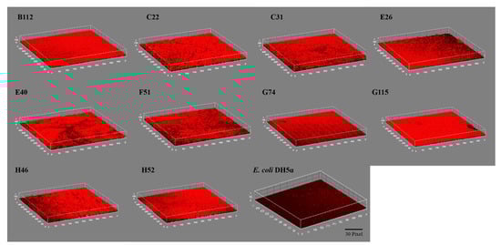 Confocal laser scanning microscope (CLSM) photomicrographs of 10 QS bacteria biofilms grown in 2216E liquid medium. All photomicrographs were taken at 72 h. E. coli DH5a was the negative control. Dyes of propidium iodide, wavelength of 559 and 570–670 nm and ×20 magnification were used to observe. Scale bar was 30 Pixel.