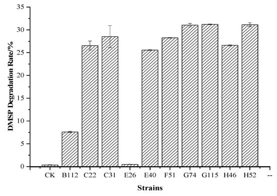 Alkaline hydrolysed into DMS was used to determine the degradation rate of DMSP. As shown in Figure 5, compared with the blank control group, most of the QS bacteria could degrade DMSP. The G74, G115 and H52 strains degraded DMSP in the medium at 31.037%, 31.218%, and 31.144%, respectively, showing strong DMSP degradation ability. The degradation of DMSP by the B112, C22, C31, E40, F51 and H46 strains was 7.585%, 26.552%, 28.518%, 25.564%, 28.263%6 and 26.609%, respectively. In addition, the E26 strain did not have the ability to degrade DMSP.