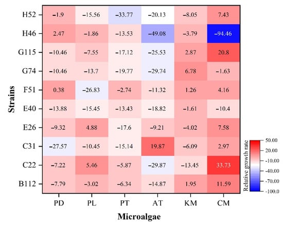 The crude extracts of QS bacteria had different effects on the growth of the microalgae (Figure 6). The crude metabolic extract of the H52 strain had a strong inhibitory effect on P. tricornutum, and the inhibitory rate was 33.77%. The crude metabolic extract of the H46 strain had a strong inhibitory effect on A. tamarense and C. marina, with inhibition rates of 49.08% and 94.46%, respectively. At the same time, the experimental results also showed that the crude metabolic extracts of the B112, C22, and G115 strains could promote the growth of C. marina, and the promotion effect could reach 11.59%, 33.73%, and 20.80%, respectively. The crude extract of the C31 strain also had a promoting effect on A. tamarense, with a promotion rate of 19.87%. The crude metabolic extracts of the other strains did not significantly inhibit or promote the marine red tide algae.