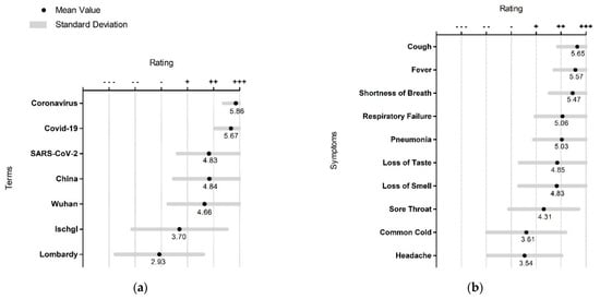 (a) Level of familiarity with synonyms and terms related to the coronavirus; (b) level of familiarity with COVID-19 symptoms; (ranging from (−−−) for completely unknown to (+++) for very well-known).