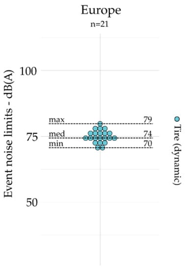 - The Economic Commission for Europe of the United Nations (UNECE). Regulation No 117 of the Economic Commission for Europe of the United Nations (UNECE)—Uniform Provisions Concerning the Approval of Tyres with Regard to Rolling Sound Emissions and/or to Adhesion on Wet Surfaces and/or to Rolling Resistance [2016/1350]; ECE: Geneva, Switzerland, 2011; p. 61. [Google Scholar]
