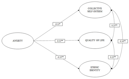 In M6 (Figure 1), it can be observed that anxiety exerts a small negative effect (b > 0.10) [49] on collective self-esteem (b = −0.125), and a moderate negative effect (b > 0.30) on QoL (b = −0.306) and ethnic identity (b = −0.333).