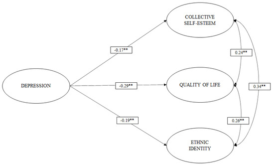 M7 (Figure 2) shows that depression has a small negative effect on collective self-esteem (b = −0.171) and ethnic identity (b = −0.191) and a moderate negative effect on QoL (b = −0.287).