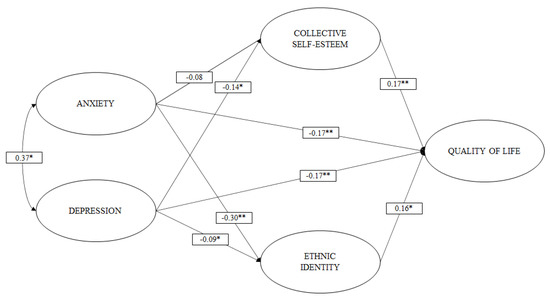 Cronbach’s alpha reliability coefficient was also estimated for each of the dimensions of the measurement models. These are for collective self-esteem 0.73, ethnic identity 0.85, anxiety 0.92, and depression 0.88. For the QoL dimensions: 0.65 (social), 0.72 (physical), 0.80 (psychological), and 0.66 (environmental).