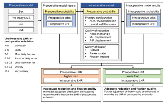 An infographic of the intertrochanteric fracture ambulatory prediction (IT–AP) tool. A preoperative model was modeled using the patient’s pre-injury demographic information, for which preoperative probability, odds, and likelihood ratio of postoperative functional outcome will be provided. After incorporating surgical-related parameters and the preoperative probability into an intraoperative model, an intraoperative prediction will be calculated and reported. A recommendation regarding the result provided by both preoperative and intraoperative prediction models will be given. NMS, New Mobility Score; CCI, Charlson comorbidity index; BMI, body mass index; LHR, likelihood ratio; M–L, medio-lateral; A–P, antero-posterior; CalTAD, calcar-referenced tip-apex distance.