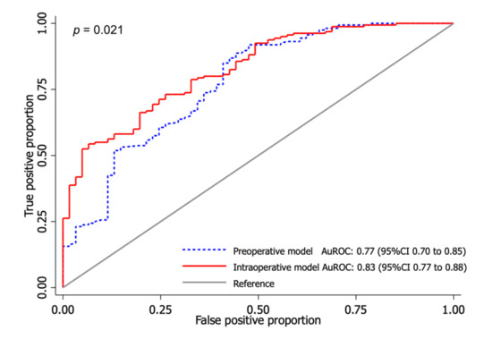 Comparison between area under the receiver operating characteristic (AuROC) curve of the preoperative (blue dash line) and intraoperative model (red line).