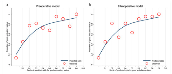 Calibration plot between an observed odds and decile divided predicted odds of (a) the preoperative model and (b) the intraoperative model.
