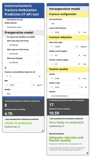 An interface of the Intertrochanteric fracture ambulation prediction (IT-AP) tool with an example information (a) preoperative model (b) intraoperative model.
