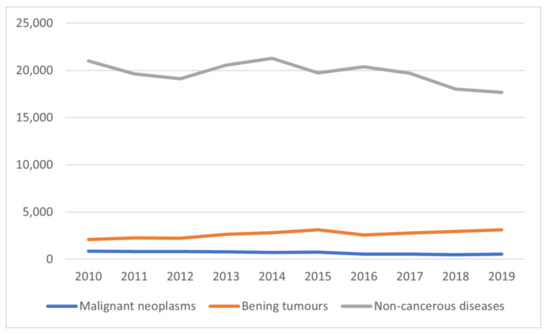 The following are available online at https://www.mdpi.com/article/10.3390/ijerph19010179/s1, Table S1: The detailed number of newly diagnosed salivary glands pathologies with respect to all analyzed ICD-10 codes between 2010 and 2019 in Poland.