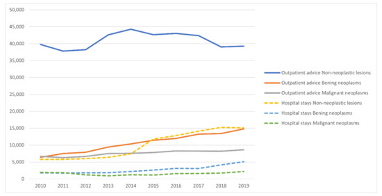 Data on outpatient and inpatient services related to salivary gland pathologies are presented in Table 3 and Figure 2. The number of outpatient services related to non-malignant salivary gland pathologies changed little between 2010 and 2019 (from 38,217 to 44,267), whereas a higher than 2.6-fold increase was noted for hospital stays in this group of patients (from 5786 to 15,073). On average, each patient with such pathology had two visits at the outpatient clinic, and every second patient was admitted to hospital for this reason. In the case of benign salivary gland tumors, the number of outpatient consultations increased 2.3-fold (from 6411 to 14,803), and the average patient with a benign tumor had four outpatient consultations. The number of inpatient stays for benign tumors also increased from 1800 to 5076 (a 2.8-fold increase). Patients with malignant neoplasms required the highest number of outpatient consultations and hospital stays, respectively: 11 outpatient services per patient, and more than 2 hospital stays. There was a small increase in outpatient visits in this group (about a 1.3-fold rise), whereas the number of hospital stays increased from 911 in 2013, to 2197 in 2019.