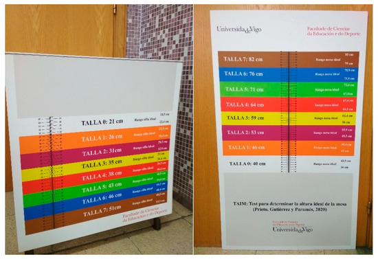 The Ideal Seat Height Test (ISHT) and the Ideal Desk Height Test (IDHT) are 3-millimetre PVC vinyl templates (see Figure 1). Both tools have been designed following the eight furniture sizes proposed by the EU catalogue [16]. Each colour determines the measurement of the ideal size in centimetres and millimetres. The ranges established between each of the bands were extracted from the equations of previous researches [34]. These measurement instruments can be downloaded for free in .tiff format from the research group website: https://www.iobserving.com/p/mobiliario-furniture.html (accessed on 1 December 2021). Afterward, they can be printed on a special printer.