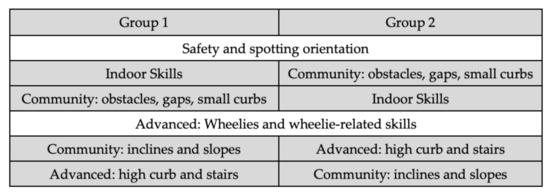 - Rushton, P.W.; Daoust, G. Wheelchair skills training for occupational therapy students: Comparison of university-course versus “boot-camp” approaches. Disabil. Rehabil. Assist. Technol. 2019, 14, 595–601. [Google Scholar] [CrossRef] [PubMed]