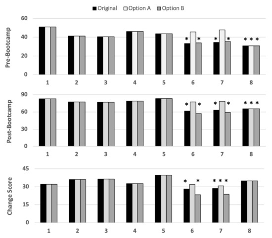 ANOVA results for pre- (F = 11.4; df = 7, 299, p ≤ 0.001) and post-bootcamp scores (F = 30.0; df = 7, 299, p ≤ 0.001) across cohorts were statistically significant, with post-hoc analyses indicating cohort 6, 7, and 8 mean scores were lower than those of cohorts 1–5. ANOVA for change score also exhibited a statistically significant difference (F = 5.2; df = 7, 299, p ≤ 0.001), with post-hoc analysis indicating cohorts 6 and 7 were lower than the remaining homogenous subset. As follow-up, ANOVA with 6 and 7 removed did not find a significant difference among the remaining cohorts (F = 2.1; df = 5, 212, p = 0.06).