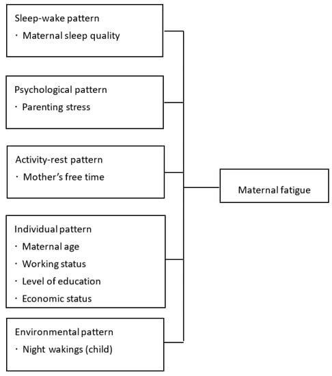 The purpose of this study was to identify factors associated with maternal fatigue based on Piper’s integrated fatigue model. The major findings of this study are as follows: (1) sleep-wake and psychological patterns such as maternal sleep quality and parenting stress were significantly associated with maternal fatigue; (2) activity-rest, individual, and environmental patterns such as free time, mother’s current age, working status, economic status, and number of the child’s night wakings were associated with a high level of fatigue.