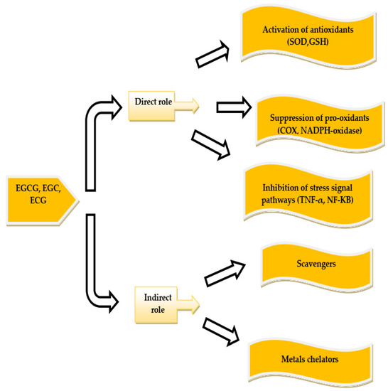 Green tea is a rich source of antioxidants. Structural properties of green tea catechins play a role in their antioxidant function. The presence or absence of the galvanic portion and the number and position of the –OH groups on the ring define their structural property. The presence of the carboxyl group enables catechins to interact with the biological substance and gives its antioxidant function by binding to hydrogen or transferring electrons and hydrogen, or both [44]. The antioxidant activity of tea appears to inhibit lipid-inhibiting alkoxyl and peroxyl radicals [45]. For example, the antioxidant activity of green tea extract is due to the increase in superoxide dismutase activity and catalase expression. These enzymes protect cells against oxidative stress [46]. The proposed mechanism for this process is the reduction of nitric oxide concentration in the plasma, which directly lowers the activity of oxygen species [13,47]. Malondialdehyde, a marker of oxidative stress, also decreases after consuming green tea [13,47]. Elevated levels of Phase II antioxidant enzymes have been observed after drinking green tea by increasing levels of polyphenols in the small intestine, lungs, and skin of mice [48] and rat prostate [49] and the oral cavity of hamsters [50]. The underlying mechanism of this process can be through the activation of MAPKs by green tea polyphenols [51]. Activation of the Nrf2 signaling pathway is also involved in this process [52]. Stimulation of phase II enzymes not only neutralizes free radicals and oxidative stress but can also have a detoxifying effect on carcinogens, such as aflatoxin B1 [52]. Studies have shown that catechins have a direct (antioxidant) or indirect (increased activity or expression) effect on oxidative stress. The following Figure 1 shows the effect of green tea catechins on oxidative stress [45].